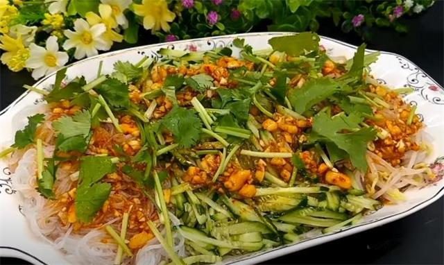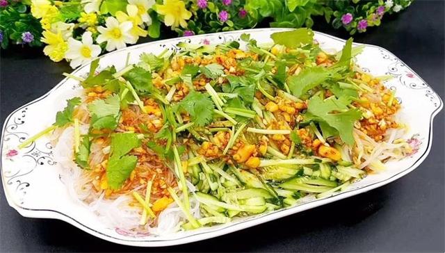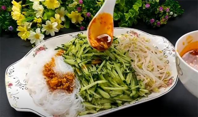 5.把黃瓜、粉絲和綠豆芽裝到盤子里,淋上調(diào)好的料汁。