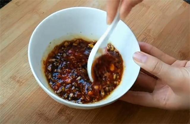 2.大蒜切成碎末裝到碗中,碗內(nèi)加1勺生抽,3勺陳醋,加半勺白糖,適量的食鹽,一勺香油,再加一勺辣椒油,攪拌均勻后備用。