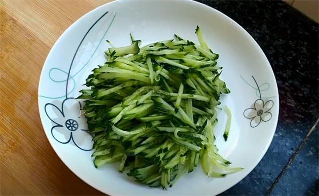 1.先準備一根黃瓜切成薄片,再切成細絲,裝盤備用。