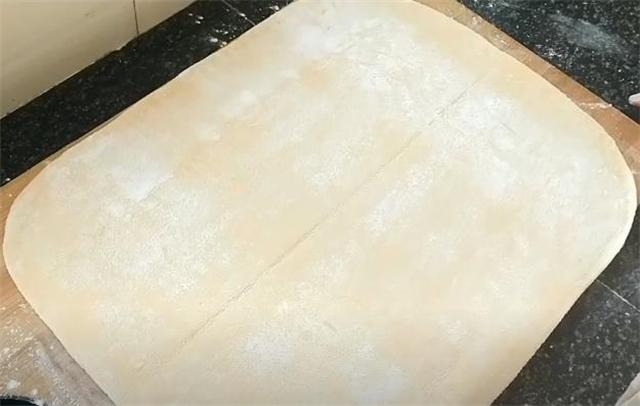 2.面團醒好后再揉一下,搟的時候沿著對角線方向搟,搟成方形的面皮,這樣后面切出來的面條長短基本一樣。