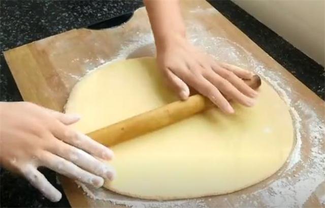 3.案板上撒點面粉,醒好的面團揉下排氣,再用搟面杖把面團搟薄。