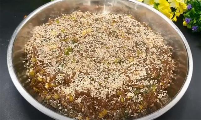 7.盆底撒點白芝麻,把粉條放進去抹平,上面再撒點白芝麻,鍋內水煮開以后上鍋蒸20分鐘左右。