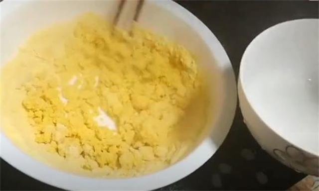 1.盆里加入玉米面,煮沸的熱純牛奶加入玉米面攪拌。