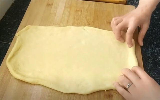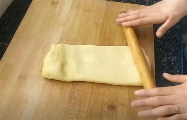 3.然后用手往兩邊拽開對疊在一起,用搟面杖搟開,再重復剛才的動作5次左右。