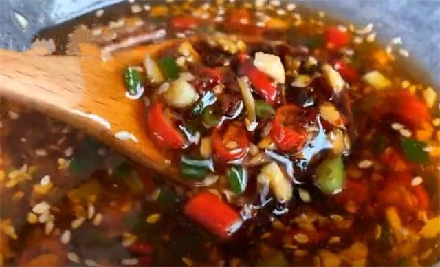 7.接下來往小料里面加入4勺生抽,3勺香醋,1勺素蠔油,2勺香油,1勺辣椒油,然后把它攪拌均勻,這個料汁真的特別的香,我們把它放一邊備用。
