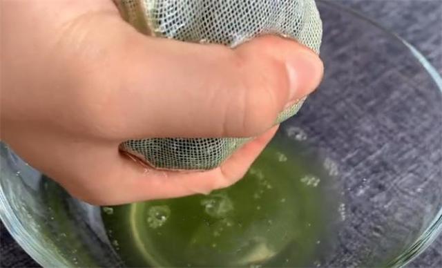 8.現在我們的黃瓜已經殺出了不少水分,我們準備一塊紗布放在碗里面,然后把黃瓜放進去,把紗布收口,把黃瓜的水分擠出來,擠過水分的黃瓜口感會更加脆嫩,盡量擠干一點。