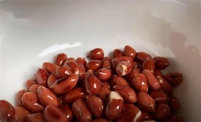 6.鍋里面剩下的油我們往里面倒入一碗花生米,開小火把花生米翻炒一下,慢慢的把它炒熟,炒至聽到噼噼啪啪的聲音就可以,炒好以后把它盛進碗里面。
