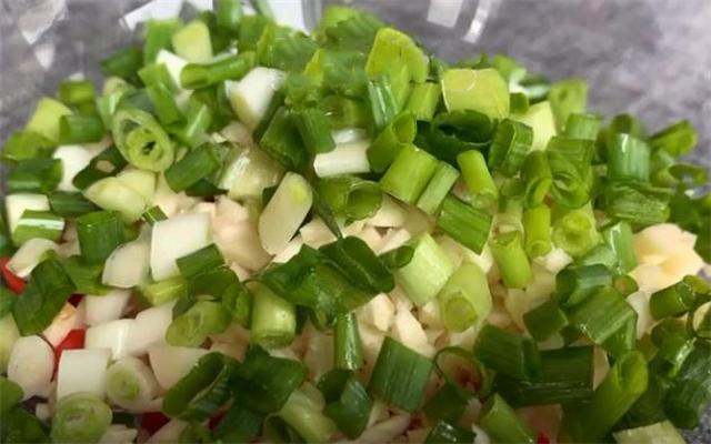 4.下面我們準備幾根小米辣,把蒂切掉,再把它切成小圈,切好放進碗里面備用,準備幾瓣大蒜切片,再把它剁成蒜末,剁好以后跟小米辣放一起,最后準備一把小蔥,把它切成蔥花,切好以后放進蒜末里面。