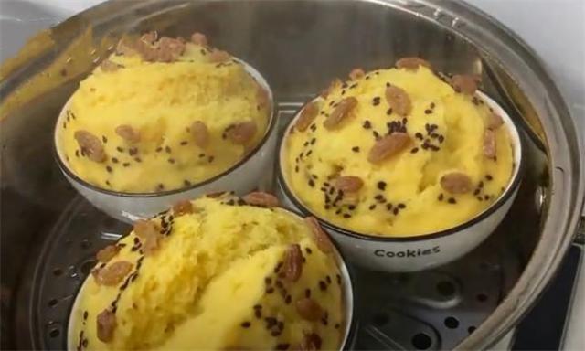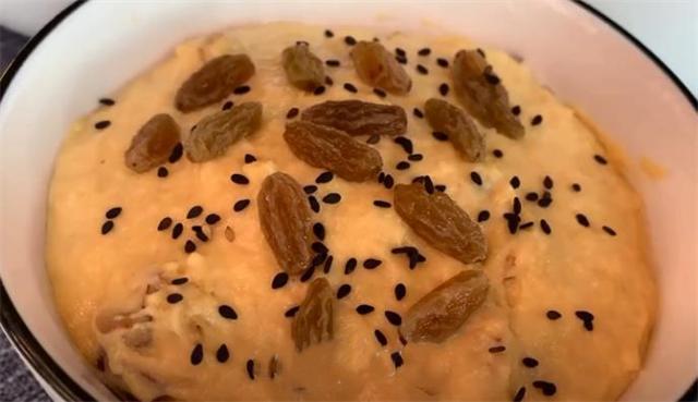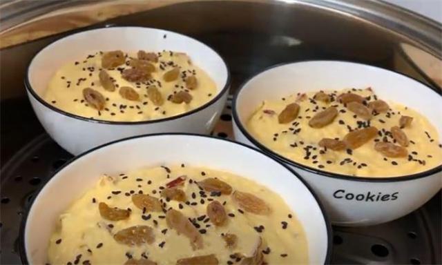 8.拌勻后準備幾個小碗,在碗的底部和四周都刷上一層油,這樣可以防止粘黏,再把面糊慢慢倒進來,注意不要倒太滿,倒八分滿就可以,用勺子把面糊表面整理平整,然后把葡萄干撒在面糊上面,最后再撒點黑芝麻增香。
