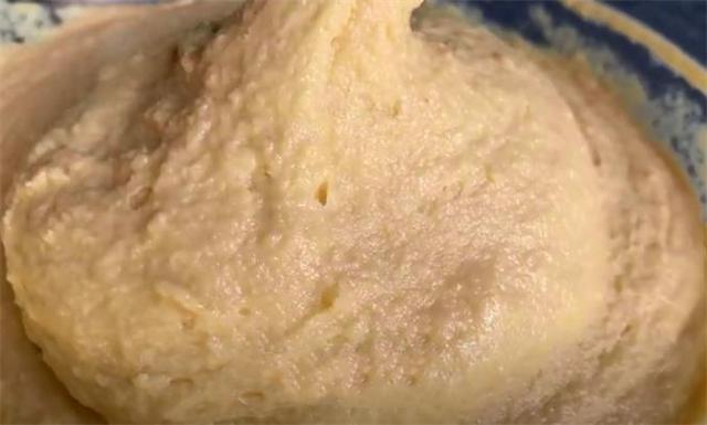 3.打好以后將奶昔倒進一個大碗里面,往里面加入4g酵母粉,20g白糖,用筷子將它們攪拌一下,攪拌至酵母粉完全融化以后,往里面加入300g的普通面粉,100g的玉米面粉,50g的糯米粉,將它們攪拌均勻,攪成這種偏干一點粘稠的面糊就可以,然后蓋上蓋子,放在溫暖的地方醒面40分鐘。