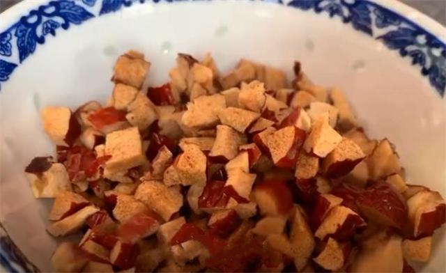 6.這會兒我們把紅棗放在案板上,把棗核剔出來,再把棗肉切成條,最后切成小丁,切好放碗里面備用。