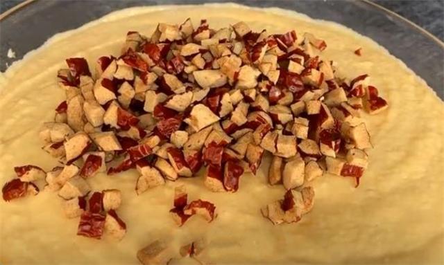 7.現在我們的面糊已經醒好了,把剛才切好的紅棗倒進去,用筷子把它攪拌均勻。