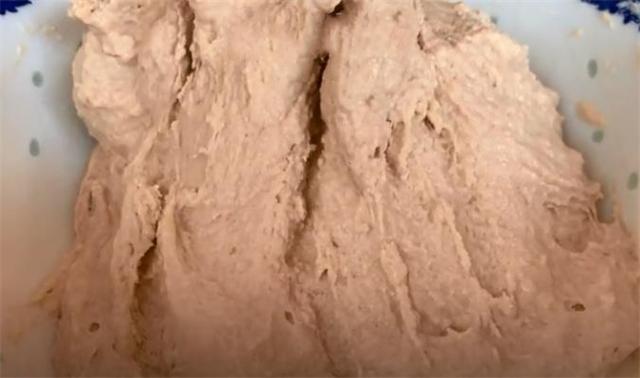 4.打好以后把小米糊倒進一個大碗里面,這里我大概倒了200毫升的小米糊,往里面加入3g酵母粉,30g白糖,2g泡打粉,用筷子攪拌均勻,把酵母粉攪拌融化就可以了,然后往里面倒入300g普通面粉,用筷子再次攪拌均勻,攪拌成這種無顆粒細膩偏干一點的面糊就可以,蓋上蓋子醒發40分鐘左右。