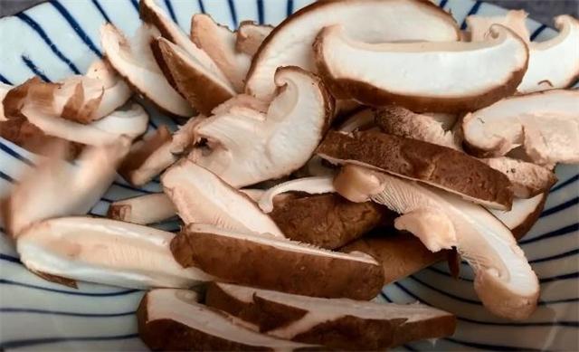 2.準備一把新鮮的香菇,大概六七朵就夠了,用剪刀把香菇的蒂剪掉,再把它切成薄片,切好放進盤子里面。