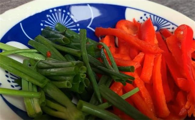 3.準備半根紅椒,對半切開,再切成細條,切好放入碗中,準備一把小蔥,把蔥白和蔥葉分開切,蔥葉切成長段,放碗里面備用,蔥白切成蔥花,放碗里面。