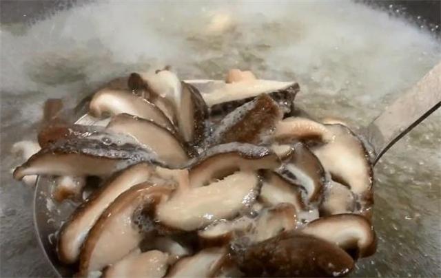 5.再把香菇也倒進去焯一下水,焯水三分鐘后把它撈出來備用。