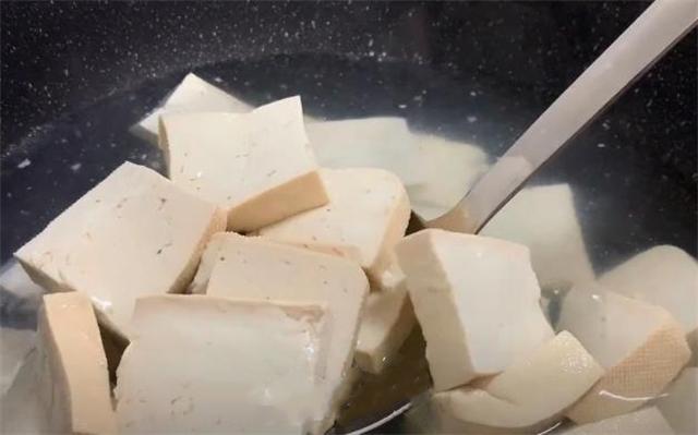 4.下面我們開火,往鍋里面加入適量的清水,蓋上蓋子,把水燒開,燒開以后往里面加入一勺食鹽,然后把豆腐倒進去焯一下水,焯水兩分鐘后把它撈出來控水。