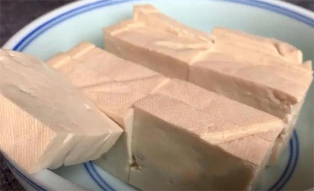 1.首先我們準備一塊老豆腐對半切開,再把它切成1.5公分左右的厚片,切好以后把它放進大碗里面。