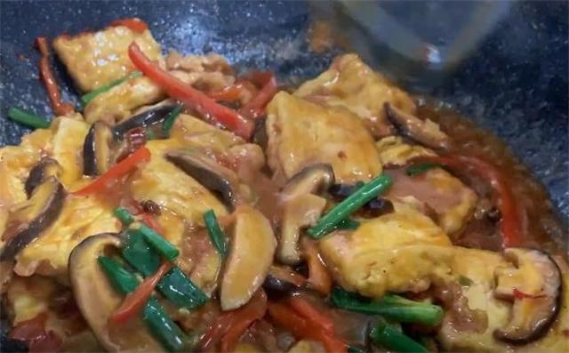 8.鍋里面剩下的油加入一小把花椒,將它炒出麻香味,炒出香味以后把蔥花倒進去爆香,爆香以后加入一勺黃豆醬,將它炒出紅油,炒出紅油以后把香菇加進來,紅椒也加進來,將它們翻炒均勻,翻炒均勻后把調好的料汁加進來,最后把煎好的豆腐也加進來,將豆腐翻炒入味,收一下湯汁,湯汁快收干的時候加入一碗水淀粉,最后把蔥段加進來翻炒均勻,翻炒均勻以后把它裝進盤子里面。
