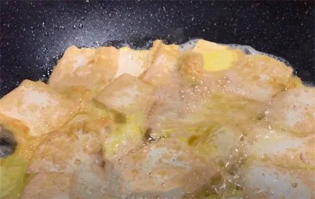 7.鍋里面加入適量的食用油,油熱以后把豆腐倒進去煎一下,等它慢慢凝固,凝固以后把它翻個面,繼續再煎一下,煎至兩面金黃的時候把它先盛出來。
