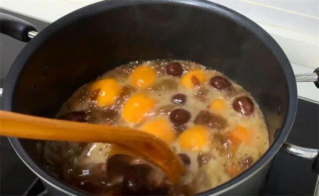 7.下面給大家分享另一種吃法,在鍋里面加入一把紅棗和冰糖,再加入清水,水燒開后把丸子放進去煮,煮5分鐘就可以吃了。