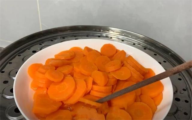 1.先準備四根胡蘿卜去皮,把根部切掉,再把它切成片,切好放進盤子里面,然后放進蒸鍋,蓋上蓋子,開大火蒸20分鐘,時間到,打開看看,像這樣用筷子能輕松扎透就可以。