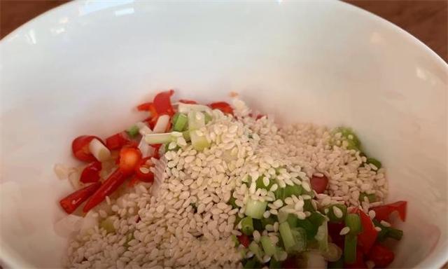 1.先準備一把大蒜,先切片,再切成蒜末,切好放碗里面備用,再準備一把小米辣,把蒂去掉,不喜歡吃辣的可以少放一點,然后切成小圈,切好放碗里面備用,準備一把小蔥,把蔥白切成末放碗里面,再準備一把香菜,切成長段備用,再往里面加入一勺白芝麻。