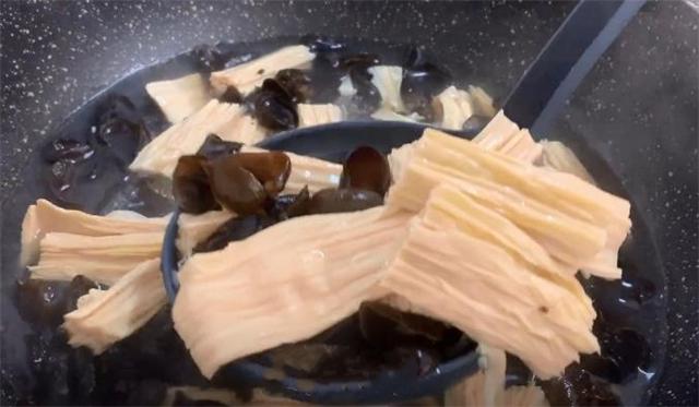 7.我們還可以拿它來拌腐竹和木耳,鍋里水燒開以后,把泡發好的腐竹和木耳放進鍋里焯水5分鐘,5分鐘后把它撈出來控干水分。