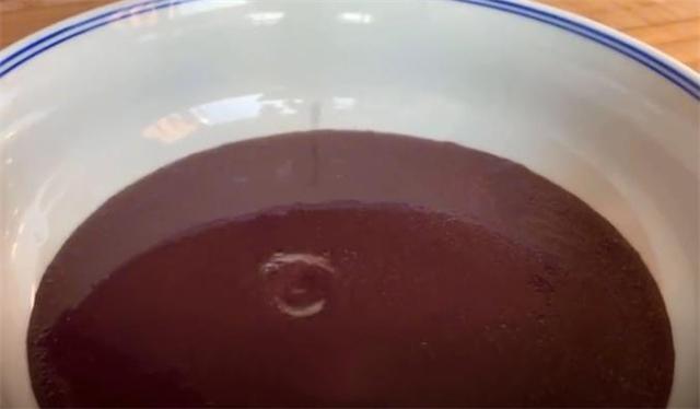 4.現(xiàn)在黑米已經(jīng)泡好了,泡米的水里面是滿滿的花青素,千萬別倒掉,可以起到美容養(yǎng)顏的作用,泡好以后直接將黑米和水一起倒進(jìn)破壁機(jī)里面,再加入200毫升清水,蓋上蓋子,選擇果蔬鍵,將它打成黑米糊,打好以后將黑米糊倒進(jìn)碗里面,你可以先少倒一點(diǎn),后面覺得干了可以慢慢加。