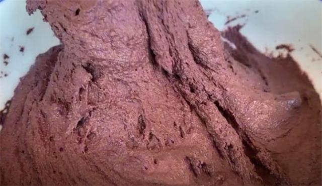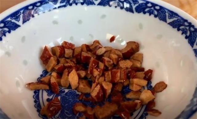 6.現(xiàn)在面糊已經(jīng)醒好了,把剛才切好的紅棗丁倒進(jìn)去,用筷子把它攪拌均勻,使紅棗丁融合在面糊里面。