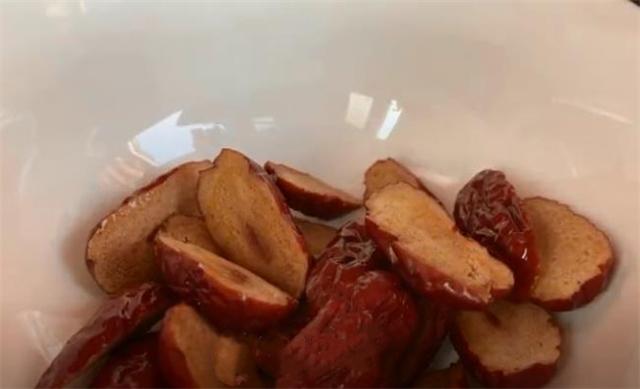 2.下面準(zhǔn)備一把紅棗放進(jìn)碗里面,加入清水把它清洗一下,然后撈出來放在案板上,用刀把紅棗切成三瓣,中間的核留著,切好把紅棗肉放進(jìn)碗里面?zhèn)溆谩?/p>