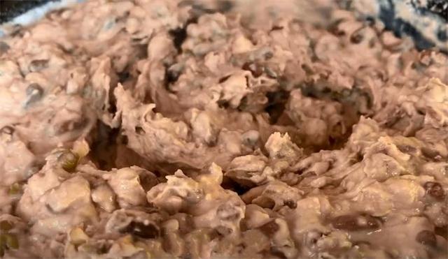 3.然后把豆子倒進一個大碗里面,用勺子不停的攪拌,使豆子的溫度降到常溫狀態(tài),等豆子變常溫后加入兩大勺糯米粉,大概50g,再往里面加入200毫升純牛奶,用筷子充分攪拌均勻,攪拌至這種偏干一點粘稠的面糊就可以了。