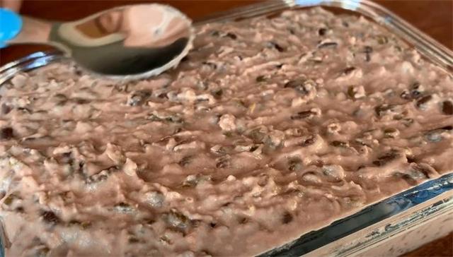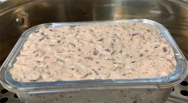 4.然后準備一個容器,在里面刷上一層油,防止粘黏,再把面糊慢慢倒進去,用勺子把表面鋪平整。