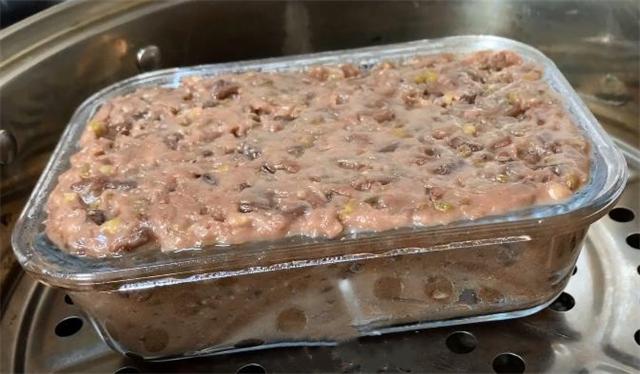 5.鋪平以后放進蒸鍋,在容器上面蓋上一個盤子,防止水蒸氣掉進去,再蓋上蓋子,開大火蒸30分鐘。