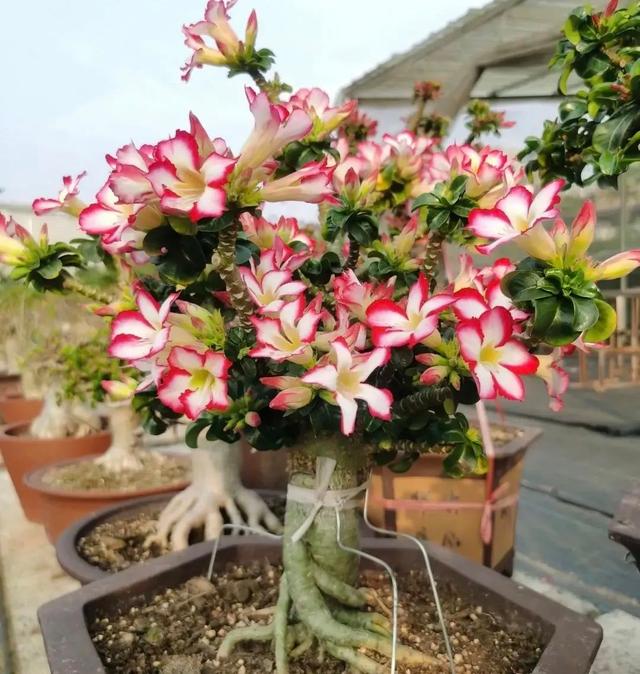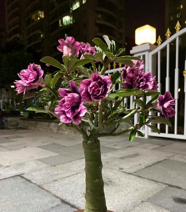 沙漠玫瑰也叫天寶花,在野外可以長成參天大樹,葉片不多,花朵卻頂在枝頭上,看起來非常有趣,卻也霸氣十足,見一次就會讓人終身難忘。現在盆栽沙漠玫瑰,也很流行,它肥大的枝干,配上鮮艷如玫瑰一樣的花朵,總是惹人憐愛,能增添室內溫馨的氣氛,給人帶來好運。