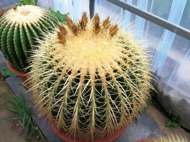 6、金琥 金琥是一種仙人球,其渾身長滿金黃色的刺,可以放在門口或客廳作為鎮宅之用。金琥喜歡溫暖干燥的環境,養護時需要放在陽光充足的地方,盆土干透后再澆水,并撒點緩釋肥。