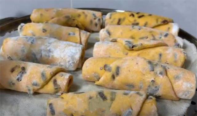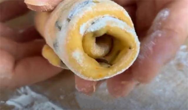 9.在案板上撒點干面粉,用手把面團按扁,再用搟面杖把它搟成牛舌狀,再從下往上把它卷起來,像這樣我們的一個生坯就做好了。