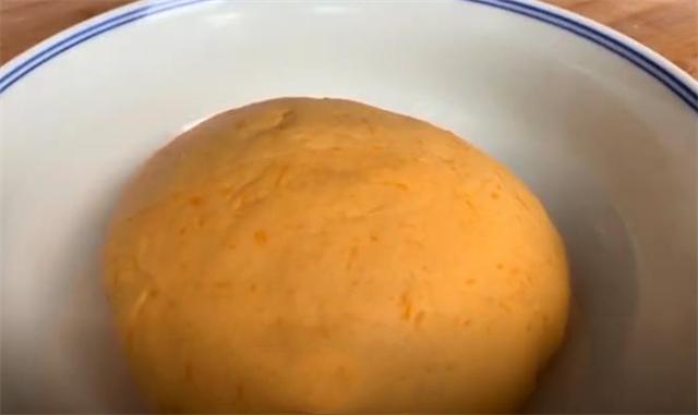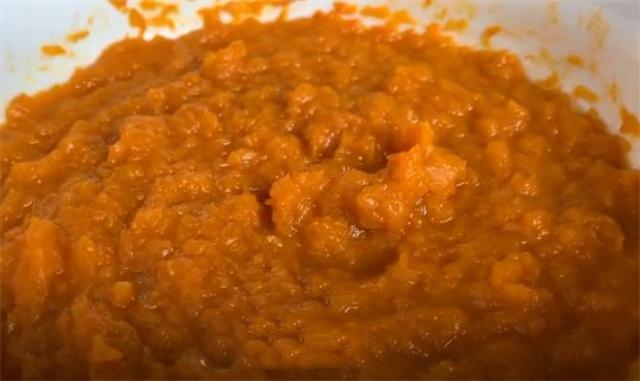 4.現在南瓜已經蒸熟了,用一根筷子能輕松穿透就可以了,把它取出來稍微放涼,再把它倒進一個大碗里面,用搟面杖把它搗成泥,搗成像這樣細膩無顆粒的狀態就可以了。