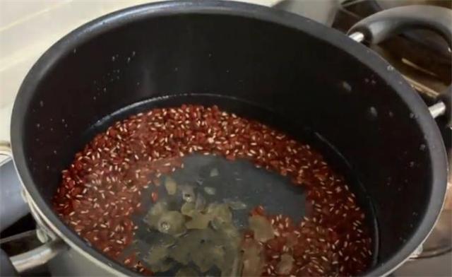 3.現在紅豆已經泡好了,把紅豆和水一起倒進鍋里面,再加入適量清水,往里面加入20g冰糖,蓋上蓋子,開大火燒開,燒開以后轉小火煮30分鐘。