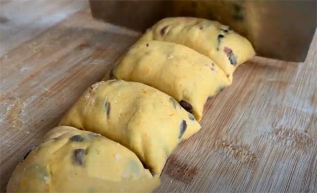 7.面團醒好后把它放在案板上揉搓一下,促進排氣,然后用手把面團揉開,再把紅豆倒在上面,然后把面團折疊起來,把紅豆包在里面,再次把面團揉搓一下,使紅豆跟面團完全融合,揉5分鐘后把它揉成一個長條,揉成長條以后再把它分成大小均勻的面劑子。