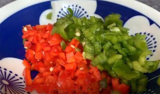 5.準備一根紅椒去籽,然后對半切開,再把它切成細絲,最后也切成小丁,放入碗中,準備一根青椒對半切開,再切成絲,最后切成小丁,切好和紅椒放在一起備用。