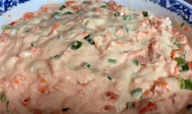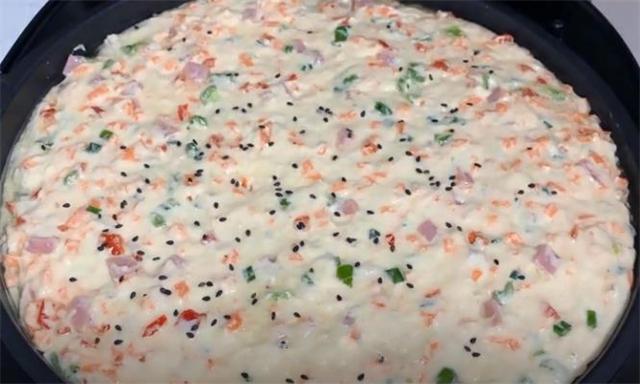 7.現在面糊已經醒好了,用筷子攪拌一下排氣,攪拌好以后把胡蘿卜倒進來,青紅椒也加進來,蔥花和素火腿丁也加進來,再次把它們攪拌均勻,使所有的菜跟面糊完全融合在一起,蓋上蓋子,再次醒發10分鐘。