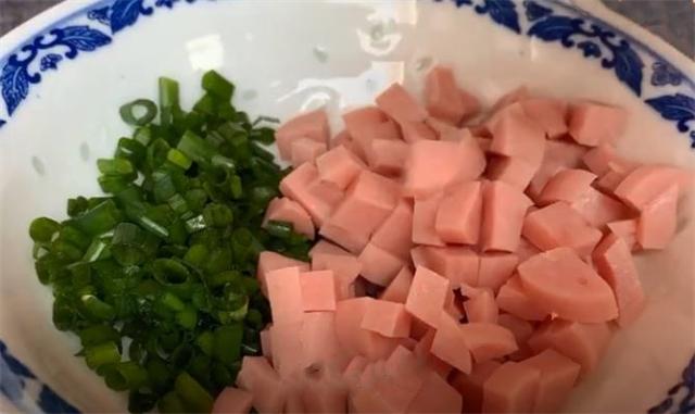 6.接下來再準備一把小蔥,把它切成蔥花,切好放入碗里面,最后準備一根素火腿腸,從中間切開,再切成小丁,切好和蔥花放在一起備用。