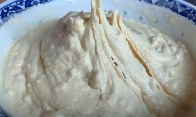 3.打好以后把它倒進一個大碗里面,往里面加入4g酵母粉,一小勺白糖促進發酵,再加一小勺鹽,用筷子把它攪拌均勻,攪拌至酵母粉完全溶解以后,往里面加入200g普通面粉,100g玉米面粉,再次把它們攪拌均勻,攪拌至像這樣無顆粒狀,細膩的面糊就可以,蓋上蓋子放在溫暖的地方醒發40分鐘。