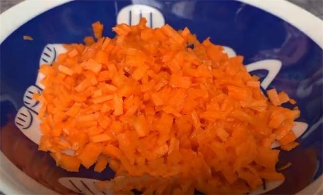4.下面準備半根胡蘿卜,先把它切成片,再把它切成細絲,最后切成小丁,切好放入碗中。