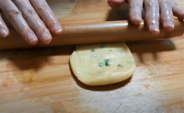 7.然后用手按扁,用搟面杖把它搟薄一點。