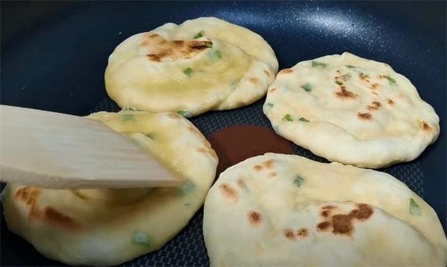 9.兩分鐘后翻個面,蓋上蓋子再烙兩分鐘,像這樣反復翻面,烙至兩面金黃酥脆,用鏟子按壓一下,餅迅速回彈鼓起就證明已經熟了。