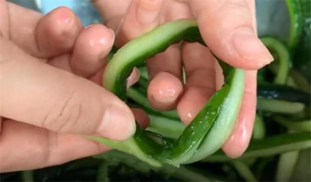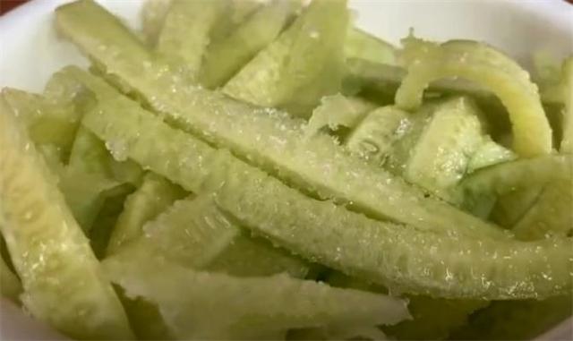 8.現(xiàn)在黃瓜已經(jīng)腌出了不少水分,把多余的水分倒掉,黃瓜腌成像這種特別軟的狀態(tài)就可以。