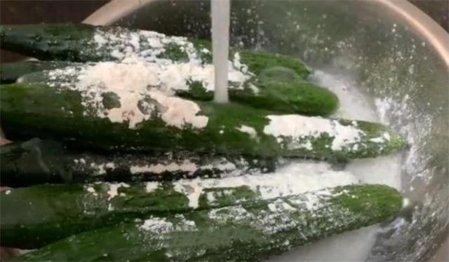 1.準(zhǔn)備幾根黃瓜,先倒入一點(diǎn)面粉在黃瓜上面,然后用流動(dòng)的清水把黃瓜清洗干凈,面粉可以有效的吸附黃瓜表皮的臟東西和蟲卵。