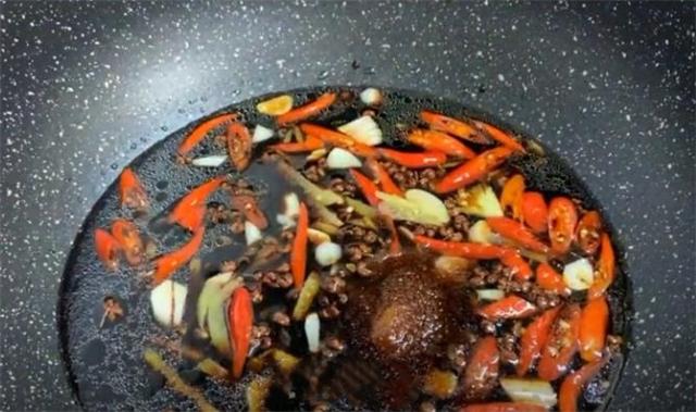 7.鍋里面加入適量食用油,把花椒放進(jìn)去炸一下,開小火炸,炸出香味后把其他的配料全部倒進(jìn)去翻炒,也是開小火慢慢炒,炒香之后把生抽倒進(jìn)來(lái),再把香醋和白糖也加進(jìn)來(lái)攪拌均勻,用小火煮開,煮開后關(guān)火放涼。